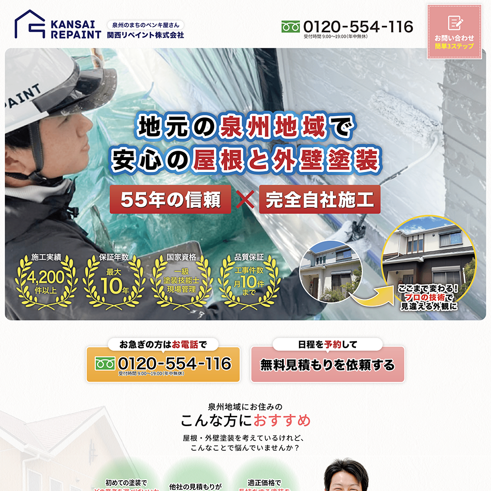 泉佐野市と泉南市を中心に南大阪と和歌山北部にて、外壁塗装業をなされておられる関西リペイント様より、LP制作のご依頼をいただきました。