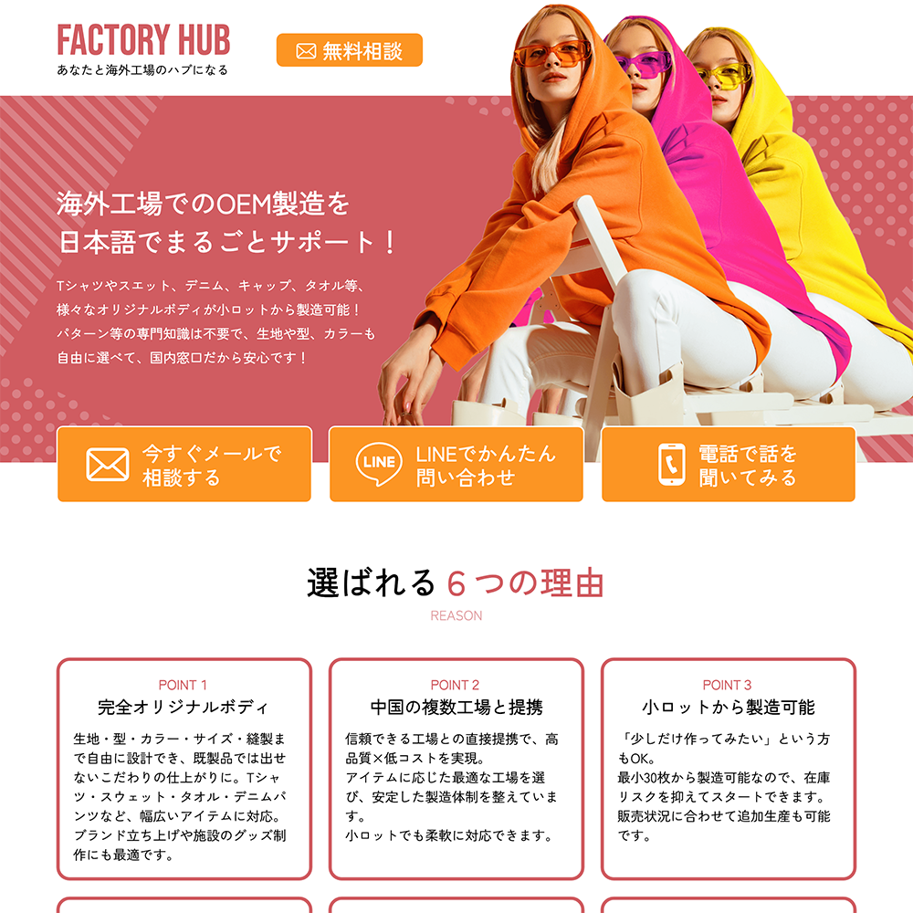 当社事業のオリジナルプリントHANDPURIにて、新たにはじめる新サービス、アパレル海外OEM工場「FACTORY HUB」のLPを制作いたしました。