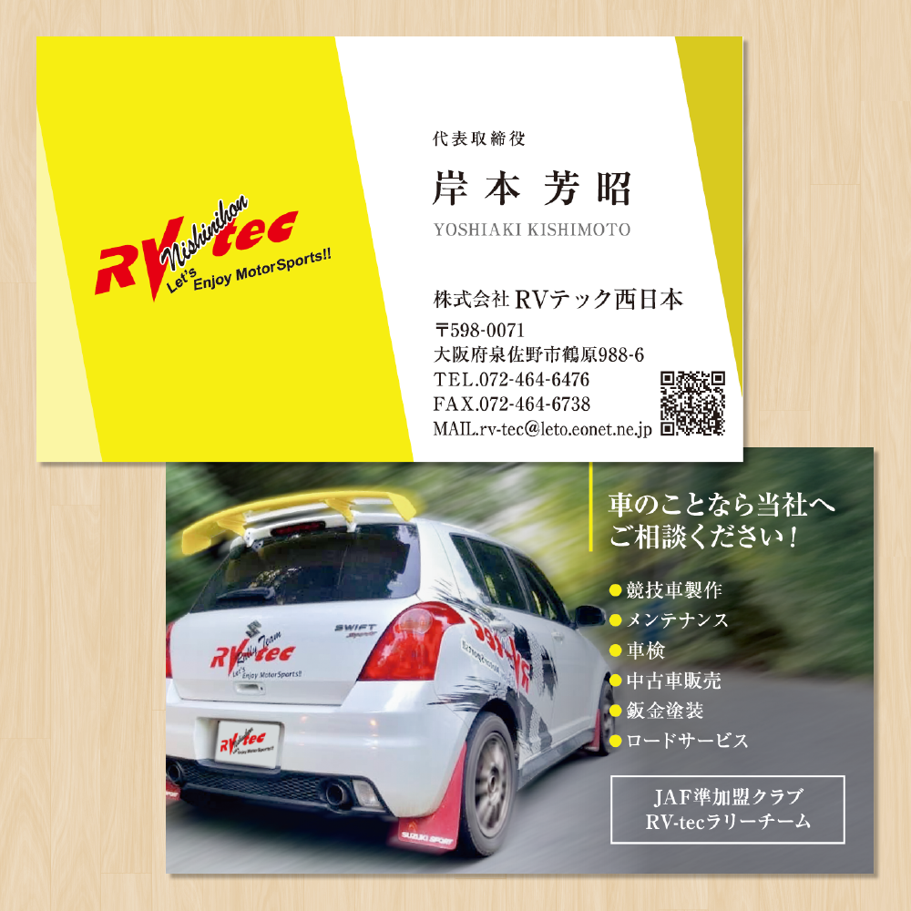 全面はご希望のカラーである黄色を背景色に、裏面にはRVテック西日本様がご参加なされておられるラリーチームのお写真を配置させていただきました。